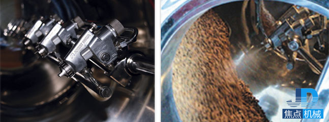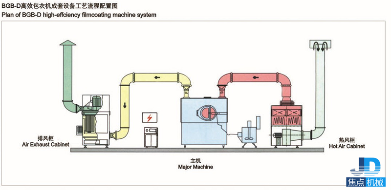 片芯在包衣機(jī)潔凈密閉的旋轉(zhuǎn)滾筒內(nèi),不停地作復(fù)雜軌跡運(yùn)動(dòng),翻轉(zhuǎn)流暢,交換頻繁,按工藝流程和合理的工藝參數(shù)自動(dòng)噴灑包衣介質(zhì),同時(shí)熱風(fēng)供給在排風(fēng)和負(fù)壓作用下,穿過(guò)片芯從底部篩孔排出,使包衣介質(zhì)在片芯表面快速干燥,形成堅(jiān)固、致密、光滑的表面薄膜。