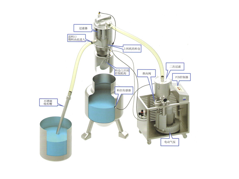 電動(dòng)真空加料機(jī)由電動(dòng)氣泵產(chǎn)生真空即負(fù)壓,這樣真空加料機(jī)將通過(guò)輸料管從儲(chǔ)料倉(cāng)中將物料吸入上料機(jī)料倉(cāng)內(nèi),再經(jīng)過(guò)過(guò)濾器將氣物分離,上料時(shí)間由PCB控制器決定,吸料結(jié)束,氣動(dòng)開(kāi)閉機(jī)構(gòu)將料倉(cāng)門(mén)打開(kāi)將物料放入相關(guān)的設(shè)備中,反吹裝置將反吹吸附在過(guò)濾器上的粉末,將粉末清除掉,然后再關(guān)閉料倉(cāng)門(mén),下一個(gè)循環(huán)開(kāi)始。