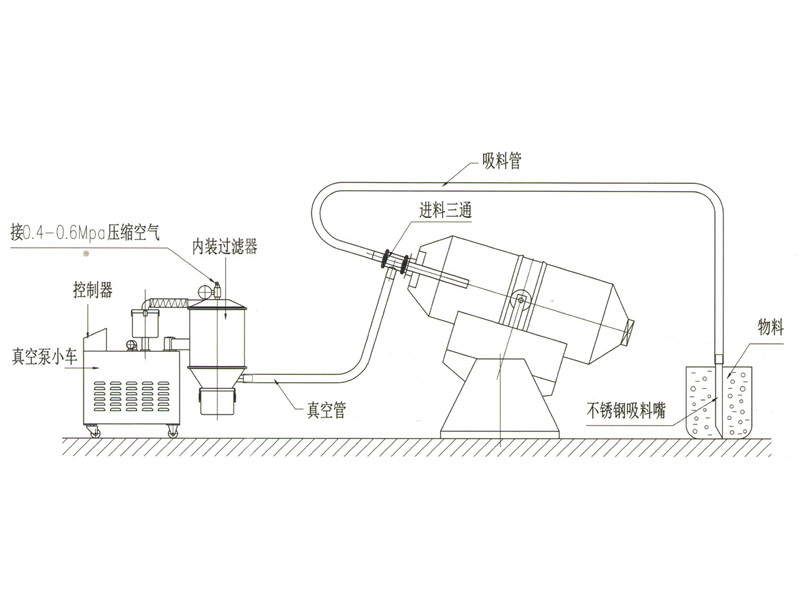 電動(dòng)真空加料機(jī)由電動(dòng)氣泵工作使密閉容積(如V型混合機(jī)、二維混合機(jī)、三維混合機(jī)等)產(chǎn)生真空即負(fù)壓,這樣真空加料機(jī)將通過輸料管從儲(chǔ)料倉(cāng)中將物料吸入密閉容積內(nèi),再經(jīng)過過濾器將氣物分離,上料時(shí)間由PCB控制器決定,吸料結(jié)束,反吹裝置將反吹吸附在過濾器上的粉末,將粉末清除掉。下一個(gè)循環(huán)開始。